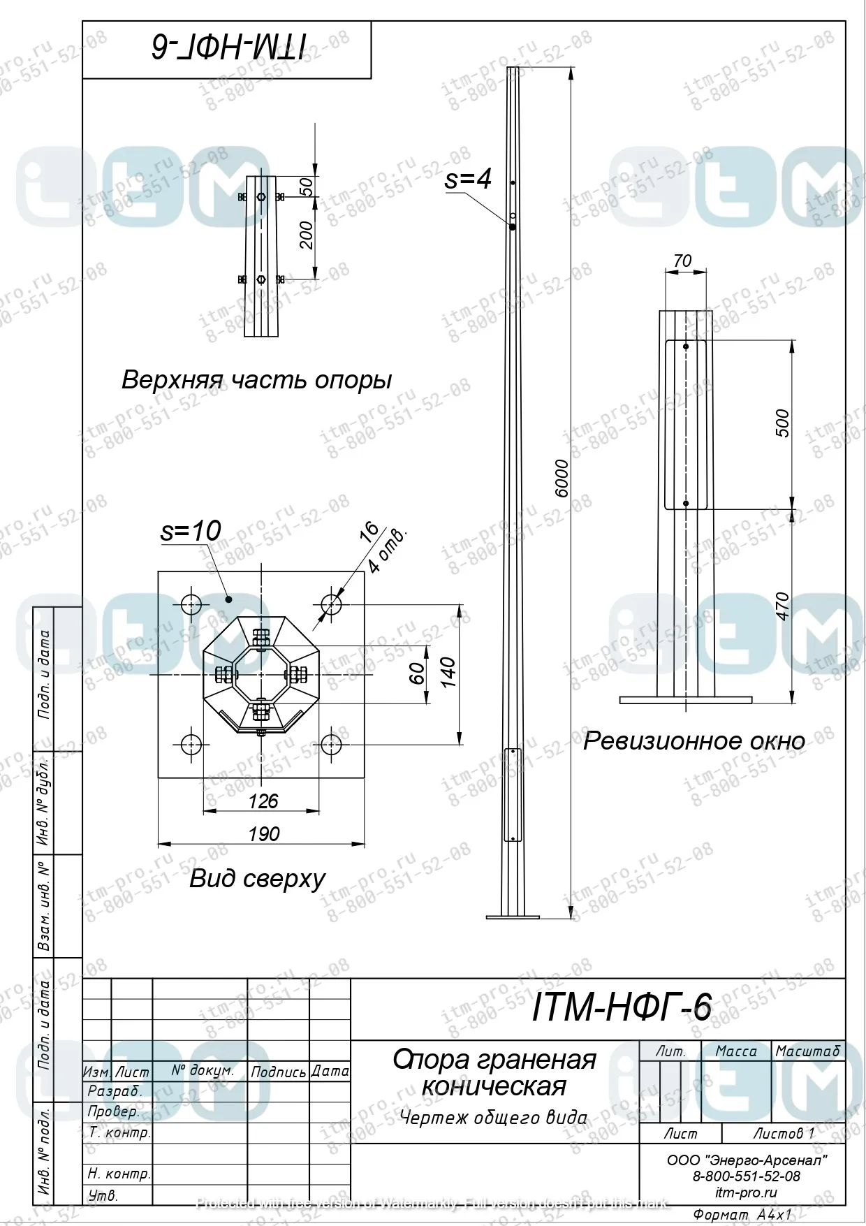 Граненая опора НФГ-6,0-05-ц относится к несиловому типу опор освещения - подвод питающего кабеля возможен только под землей, для обслуживания подключения в опоре  предусмотрен специальный лючок, расположенный в нижней части.